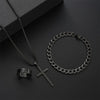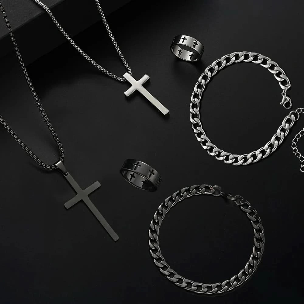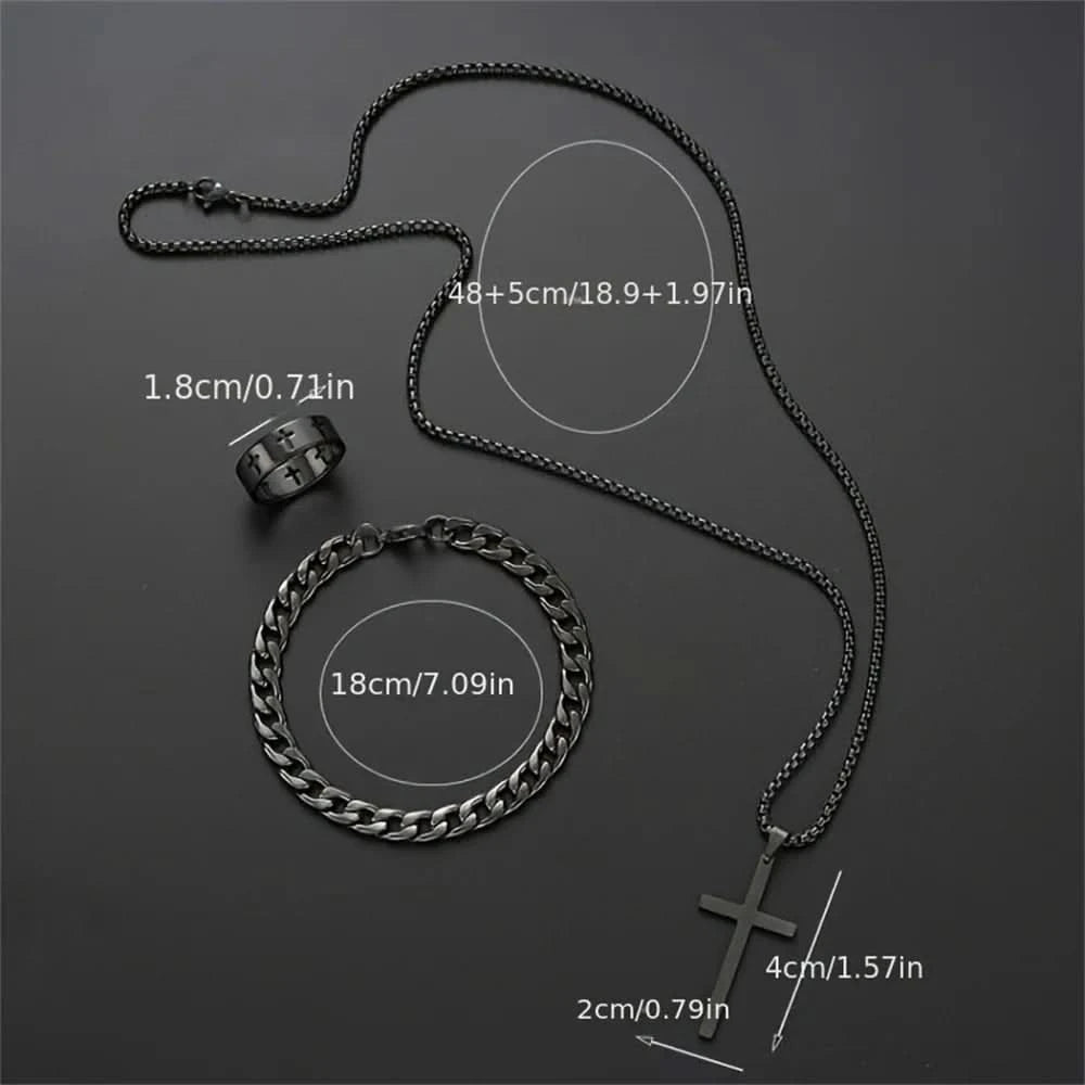 This set is perfect for any man looking to elevate their style. The design is simple and clean, making it a versatile addition to any collection. Made with high-quality stainless steel, this set is durable and long-lasting. The set includes a necklace, bracelet, and ring, all featuring a cross design. The set comes in both silver and black color options, allowing you to choose the one that best suits your style. Upgrade your look with this stylish and modern 3-piece stainless cross set.