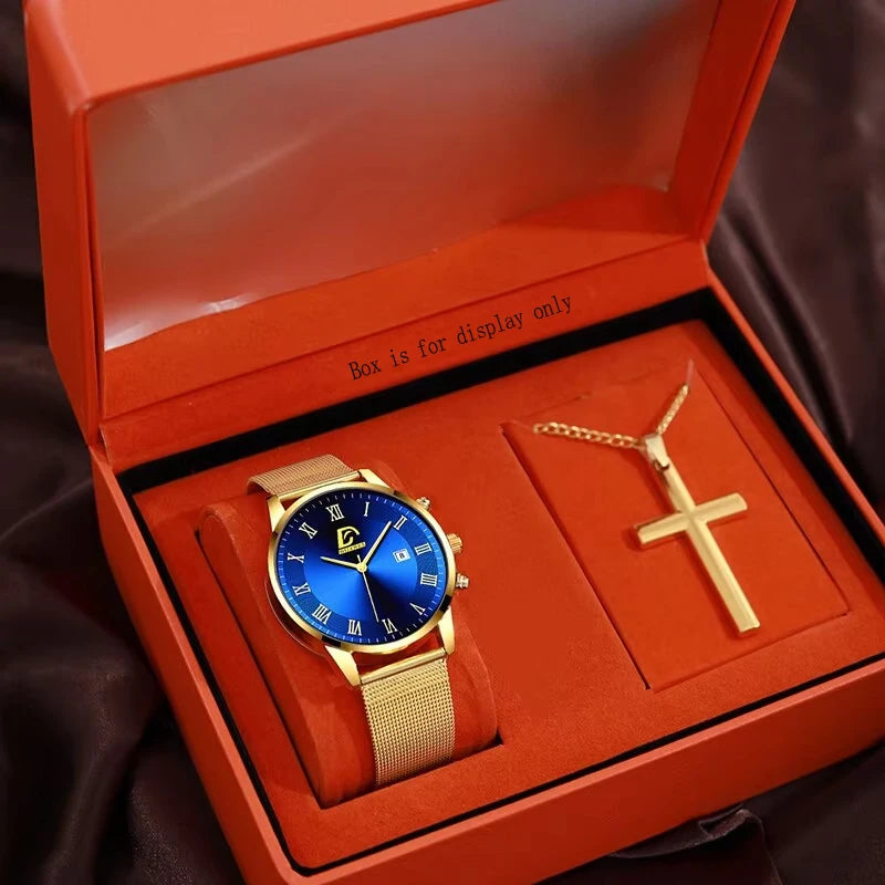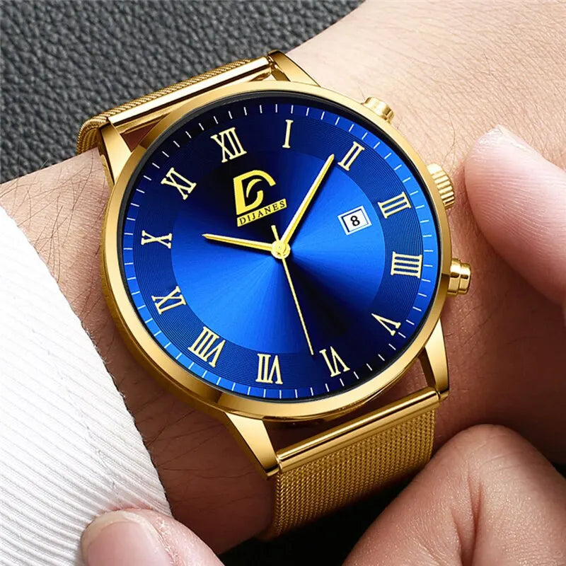 Elevate your style with this stunning watch set from Stone Ember. The set includes a gold and blue watch, perfect for adding a pop of color to any outfit. Made with high-quality stainless steel, this set is durable and long-lasting. The watch features a complete calendar, making it both stylish and functional. With a band length of 23.5cm and a case thickness of 10mm, this set is the perfect size for any wrist. The quartz movement ensures accurate timekeeping, while the water resistance depth adds an extra layer of protection. Upgrade your accessory game with this must-have set.