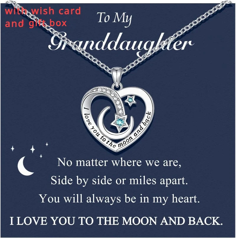 Show your granddaughter just how much she means to you with this beautiful necklace. The delicate pendant features the phrase 'I love you to the moon and back' engraved in elegant script, a sentiment that is sure to touch her heart. The necklace is made of high-quality materials, including a durable chain and a stunning moon-shaped pendant adorned with sparkling crystals. It's the perfect accessory for any outfit and a constant reminder of your love for your granddaughter.