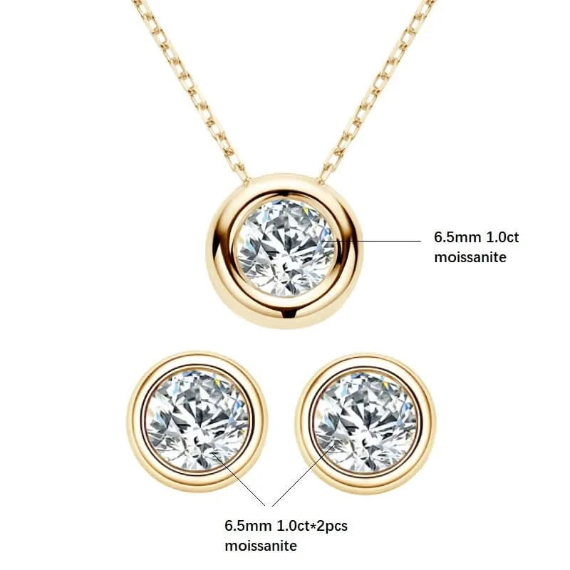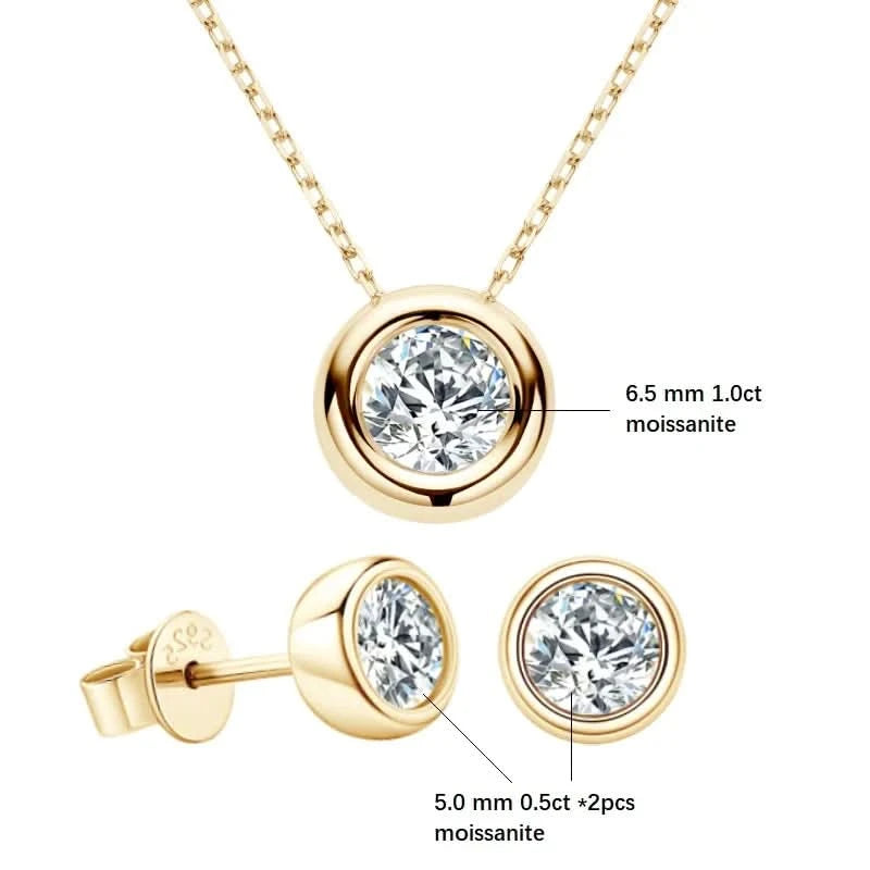 Simple, stunning, and made with sterling silver, this round moissanite jewelry set from Stone Ember is the perfect addition to any jewelry collection. The set includes a necklace and stud earrings, both featuring round cut moissanite diamonds. The metal stamp of 925 ensures the quality and authenticity of the silver used in this set. Each piece in this set comes with a certificate, guaranteeing the quality and value of the moissanite diamonds. The total weight of the set is approximately 5.22g, making it lightweight and comfortable to wear. The main stone in the necklace is a 6.5mm round cut moissanite diamond, while the earrings feature two 5.0mm (0.5ct) and one 6.5mm (1.0ct) round cut moissanite diamonds. Known for its durability, moissanite has a rating of 9.25-9.5 on the Mohs scale, making it extremely durable and perfect for everyday wear. With a refractive index of 2.39, these moissanite diamonds have a brilliant sparkle that is sure to catch the eye. The stones are also graded as ideal cut, ensuring maximum brilliance and shine. The color of the stones is a clear white, giving them a classic and timeless look. The round cut and bezel setting of the stones add to the overall elegance of the set. With an average clarity of VVS1 and color grade of D-E, these moissanite diamonds are of the highest quality and will make a stunning addition to any outfit.